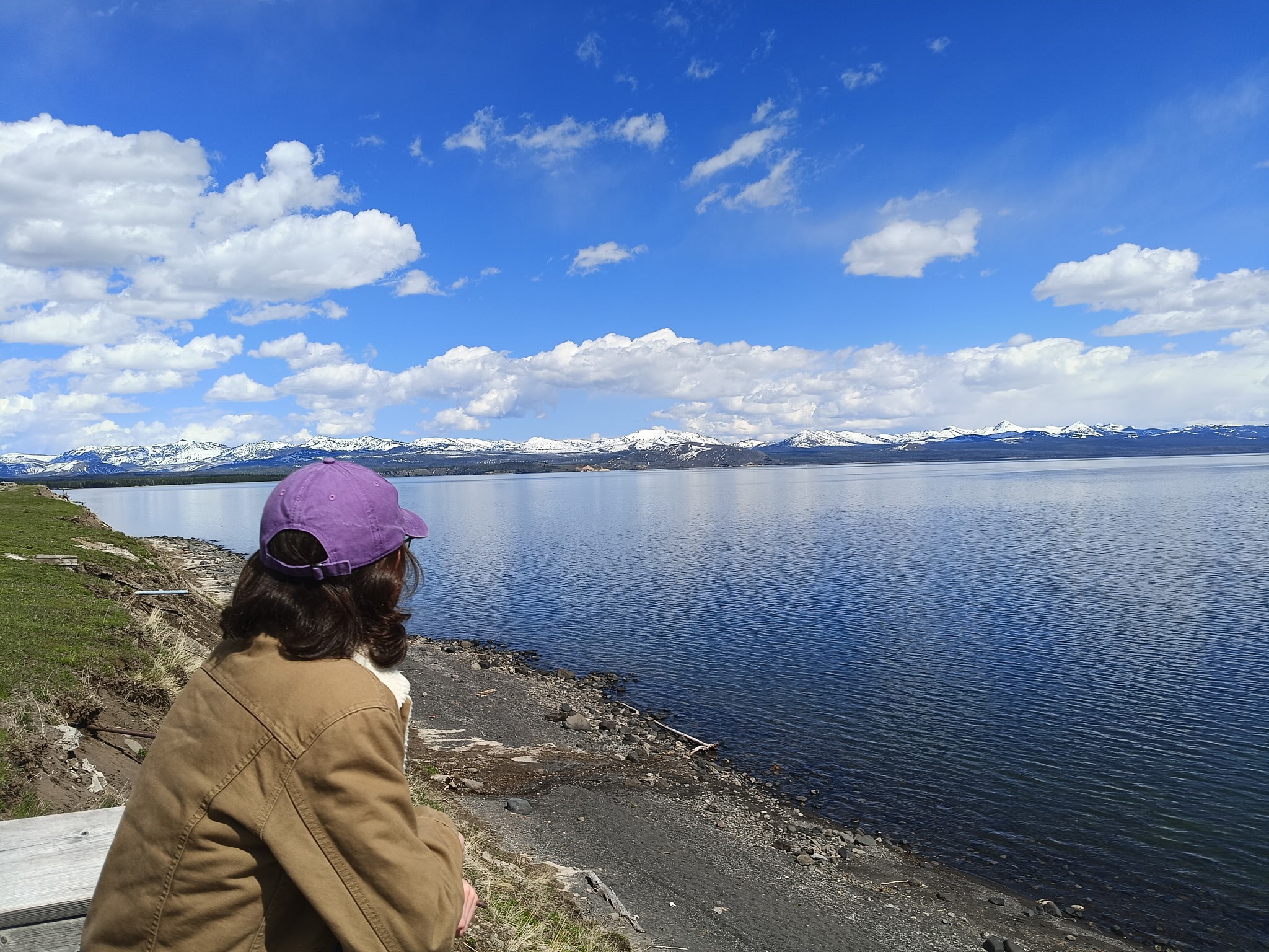 Me, admiring Yellowstone Lake from the balcony below Lake Hotel